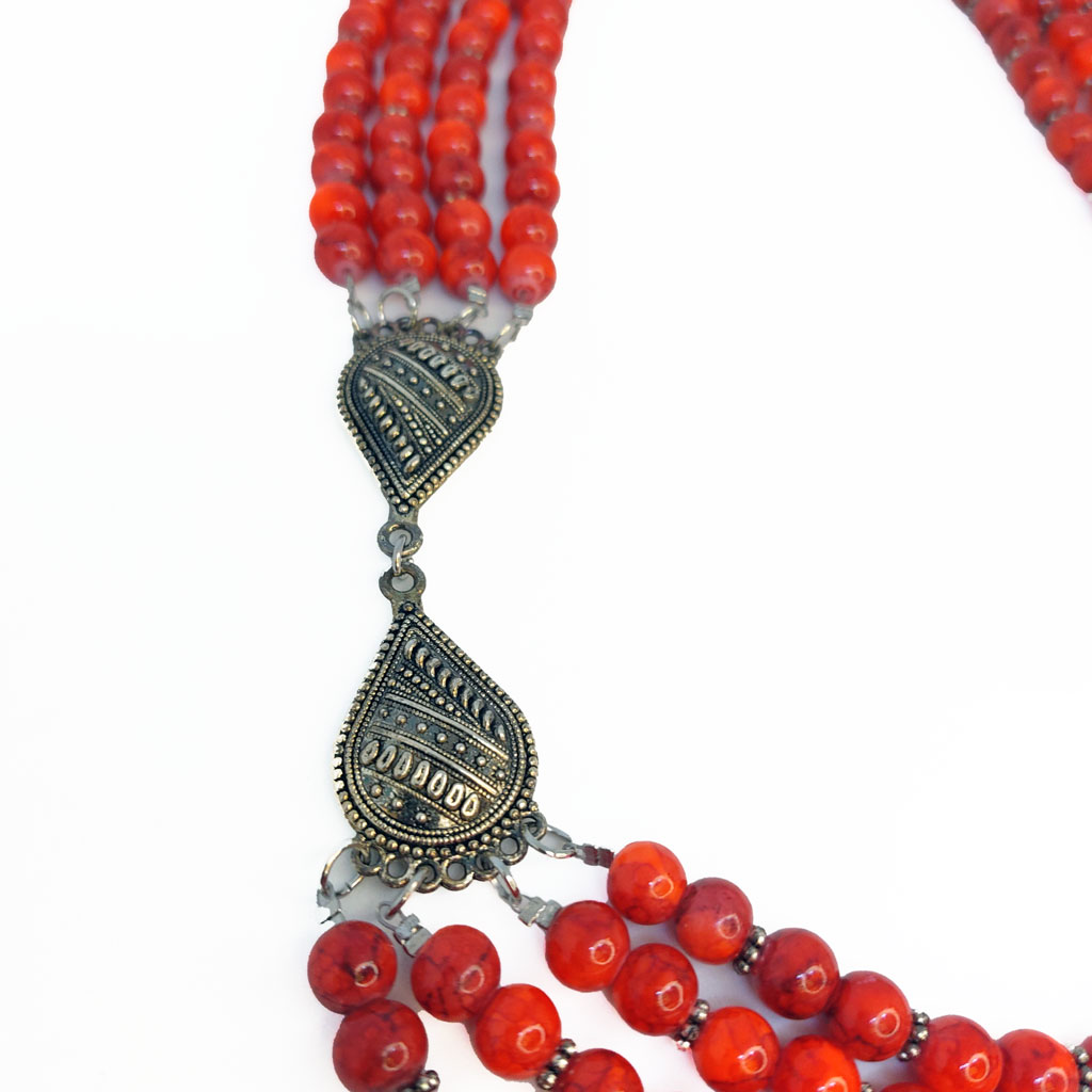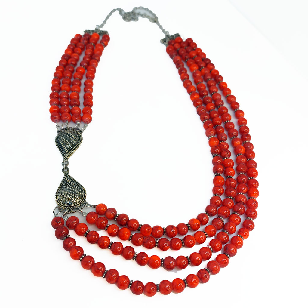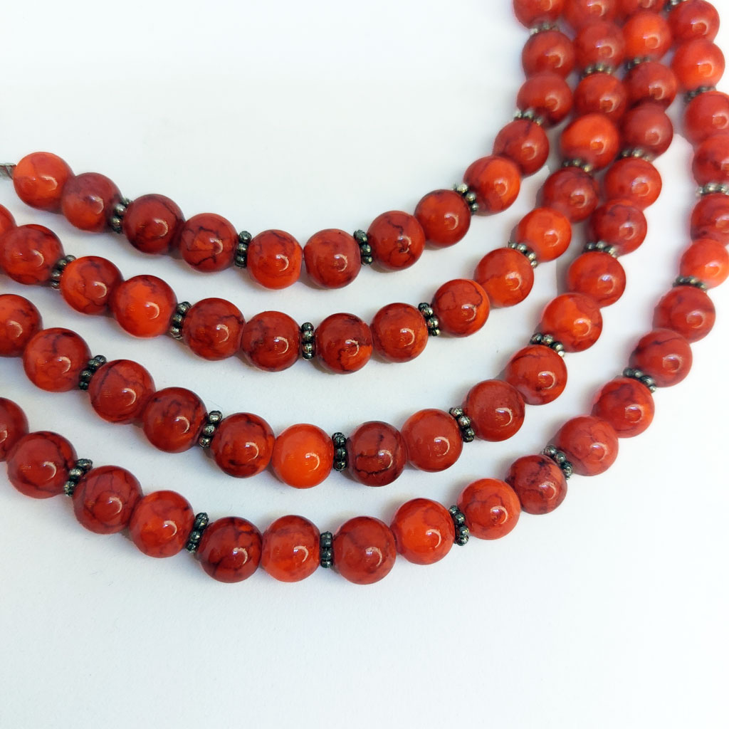 • هيكل متعدد الطبقات: يتكون العقد من أربعة صفوف متتالية من الأحجار الكروية المصقولة بلونها البرتقالي القرمزي الغني، مما يمنح التصميم انسيابية وكثافة مذهلة على الصدر.