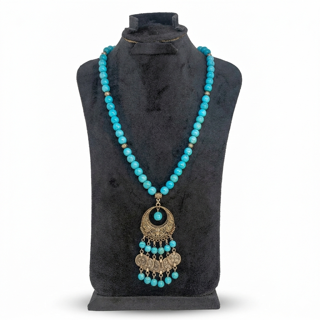 أضيفي لمسة من سحر الشرق إلى إطلالتك مع عقد “هلال البادية”، القطعة التي تمزج بين صفاء حجر الفيروز وعراقة المشغولات النحاسية اليدوية المطلية بالنيكل .