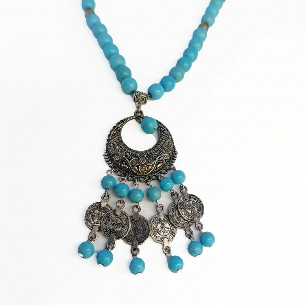 شرابات العملات المعدنية: تتدلى من الهلال دلايات صغيرة مرصعة بحبات الفيروز مع عملات نحاسية تقليدية، مما يضفي حركة انسيابية وصوتاً خافتاً يذكرنا بحلي البادية الأصيلة.
